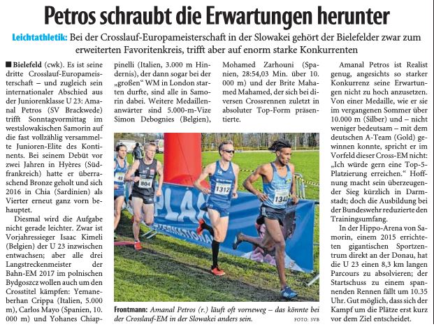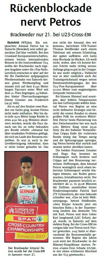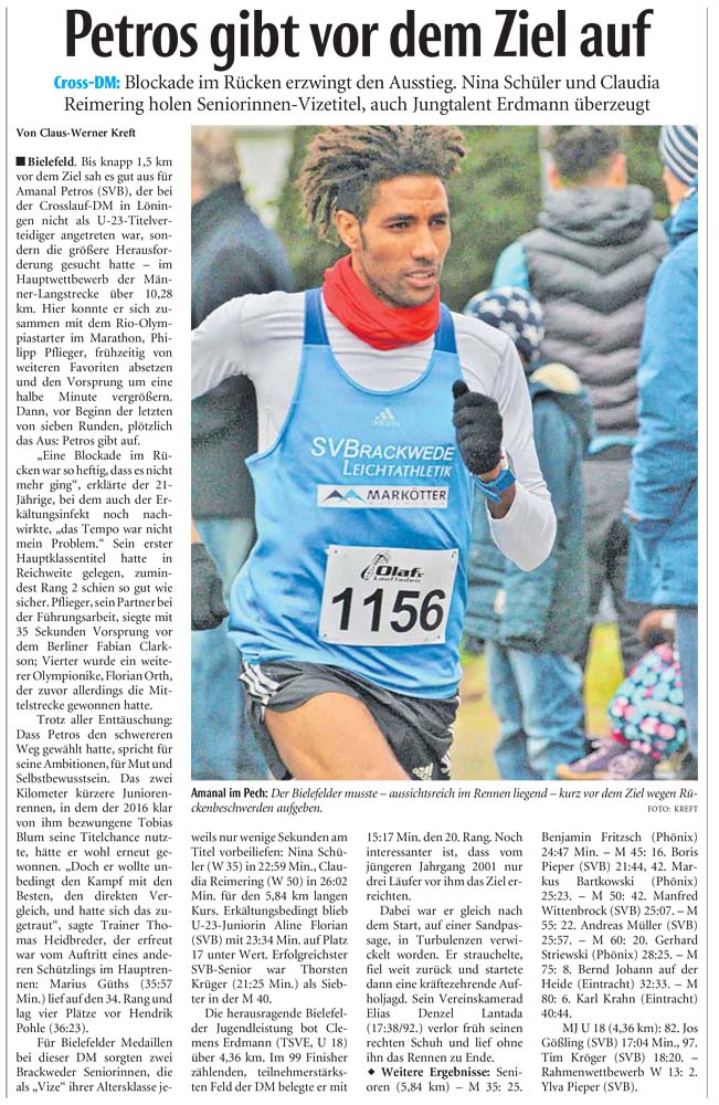 "Ich bin sehr zufrieden, besser geht's nicht. Ich habe wenig trainieren können, weil ich bei der Bundeswehr war", sagte Petros nach dem 9.000 Meter langen Kurs. "Bei der Cross-EM will ich in die Top Fünf laufen." Dorthin begleiten könnte ihn unter anderen Patrick Karl (TV Ochsenfurt). Der Hindernisspezialist versuchte mehrmals vergeblich die Lücke zu den Führenden zu schließen und wurde am Ende Fünfter. Auf Rang sechs folgte Kidane Tewolde (LG Olympia Dortmund).